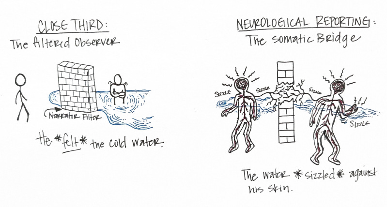 In Deep Third POV, this requires stripping away the “observer.” Instead of adding filtering verbs—“He felt the cold water”—which positions a narrator between the character and the sensation, we might write: “The water sizzled against his skin.” Here, the reader is no longer watching a character experience a stimulus; they are experiencing the stimulus alongside the character’s nervous system.